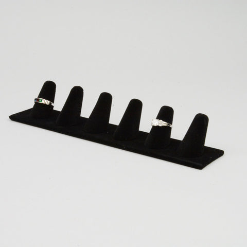 Black flocked 6 finger ring display. Short fingers. Holds 6 rings size 1-9